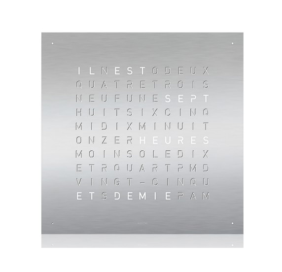 Le modèle s’accroche au mur comme un tableau et peut également se poser sur un support en verre acrylique. L’horloge est disponible dans plus de 20 langues. Fonctionne sur secteur.
