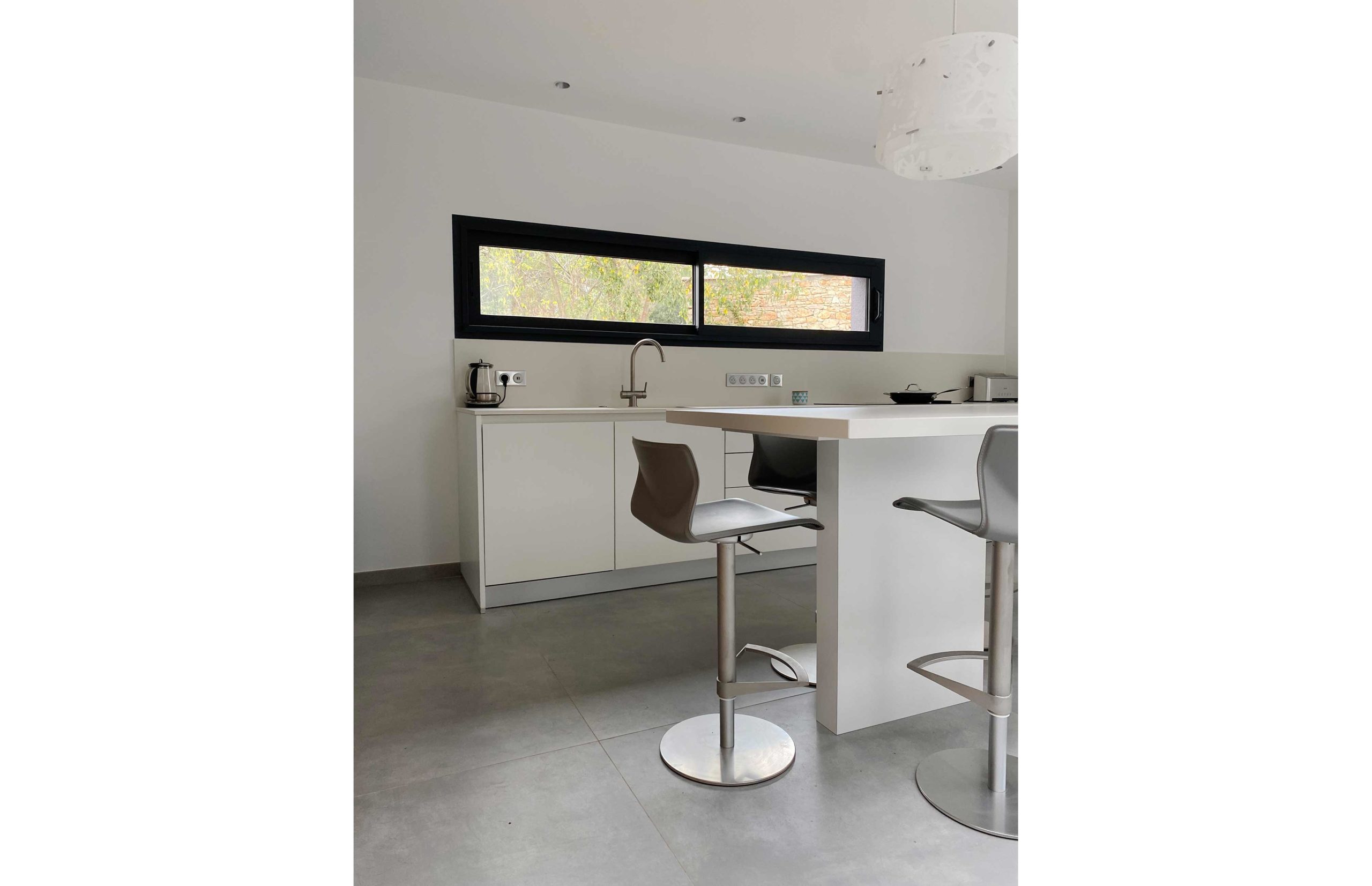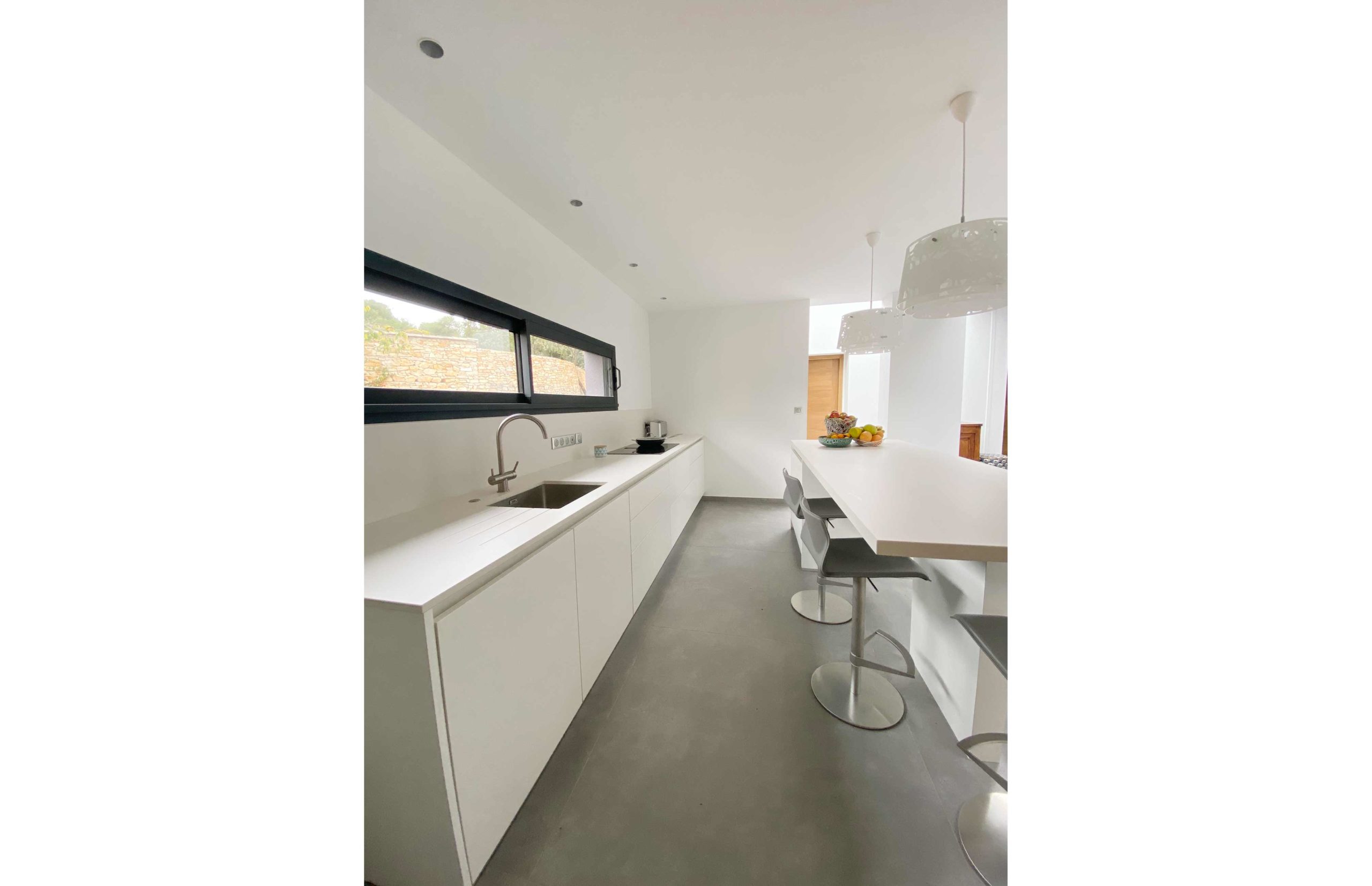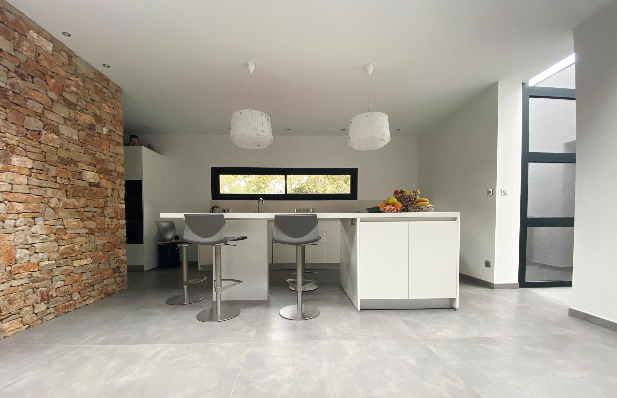 Dans une belle maison contemporaine, une cuisine aux lignes pures qui se fond parfaitement avec la pièce