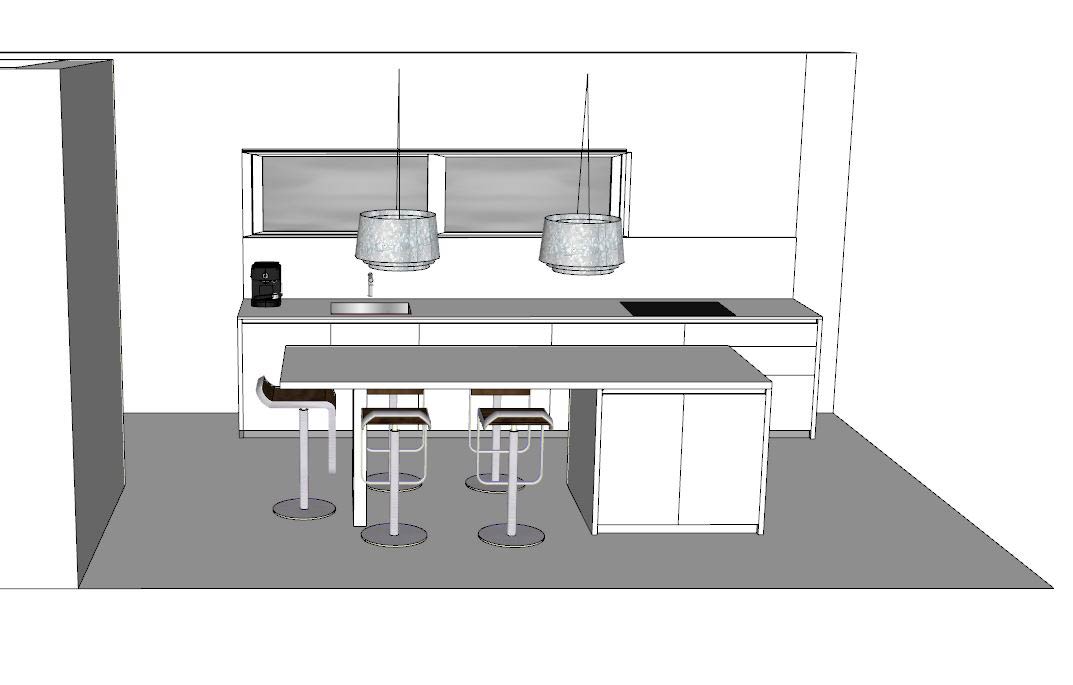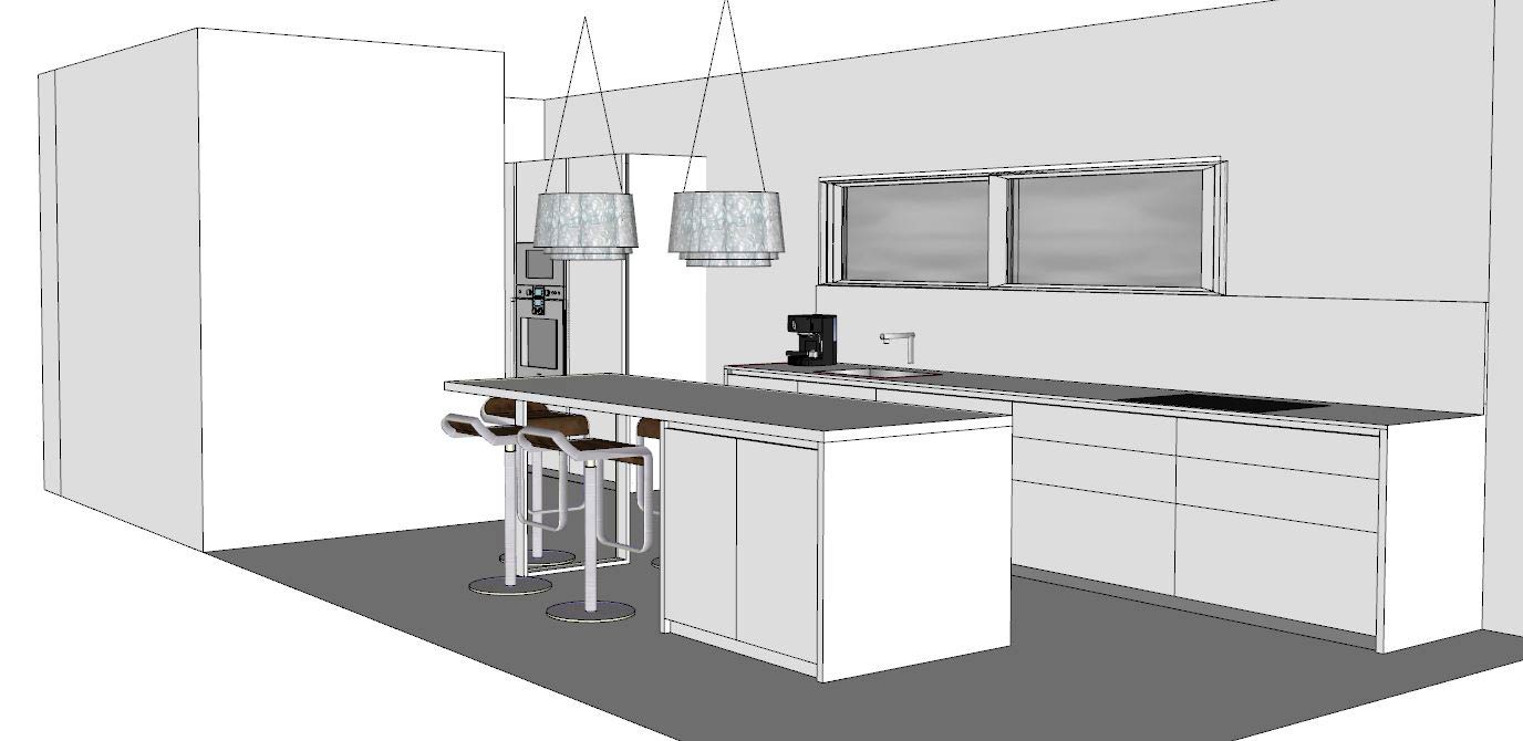 Modèle Gamma avec un linéaire cuisson en stratifié satin blanc et plan de travail en céramique. Ainsi qu'un ilot repas pour 5 personnes dans les même finitions. Concernant l'électro-ménager celle-ci est équipée d'une hotte de plaque de cuisson, un four pyrolyse et un combi vapeur VZUG.