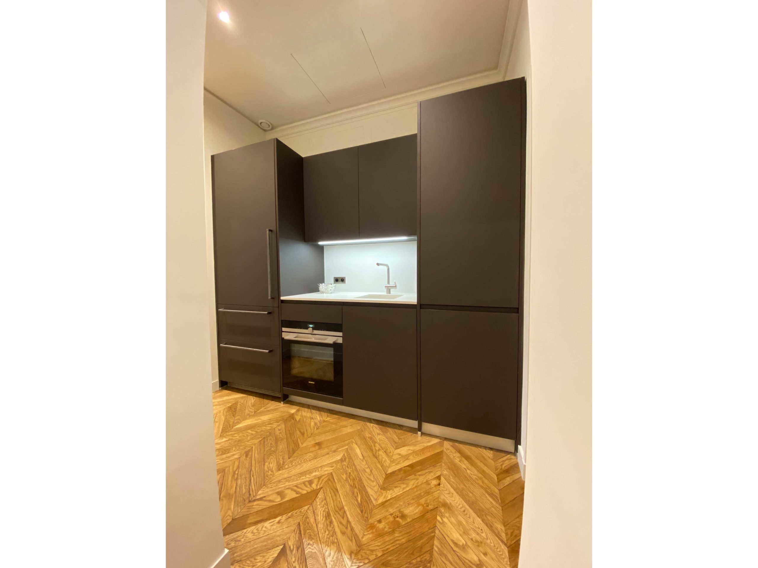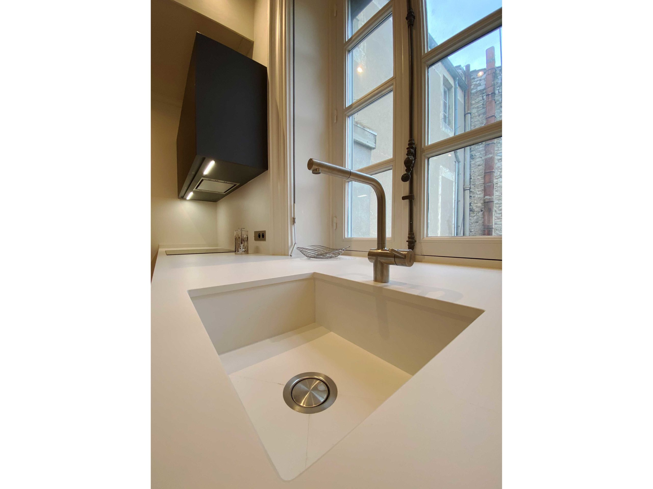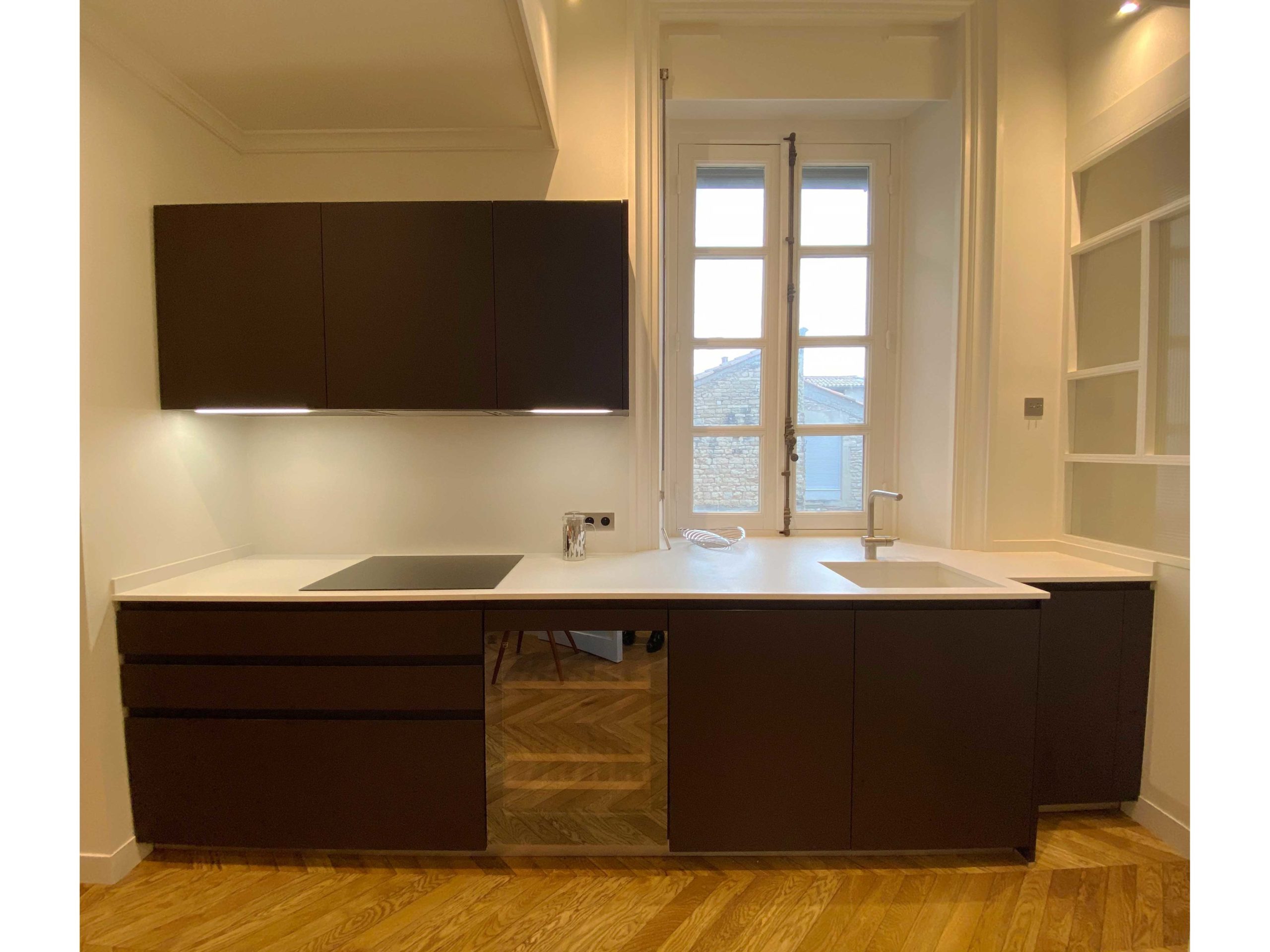 Dans un appartement entièrement rénové en plein cœur de ville, une cuisine chaleureuse aux couleurs chaudes
