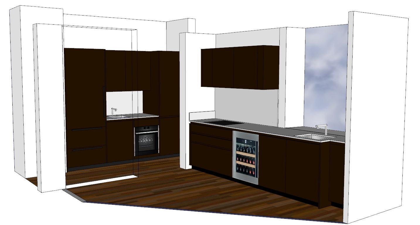 Un mélange des collections convivium et Artusi avec les façades en phénix cacao et les poignées " elegant". Concernant le plan de travail, c'est de la céramique blanche ainsi que pour la cuve de l'évier